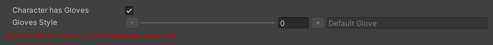 If we go to the “Character Clothes” tab, you should be able to see a new section with a tick box next to it called “Character has Gloves”. You can enable and disable this option but we aren’t able to select any gear. We now only see two messages in red: