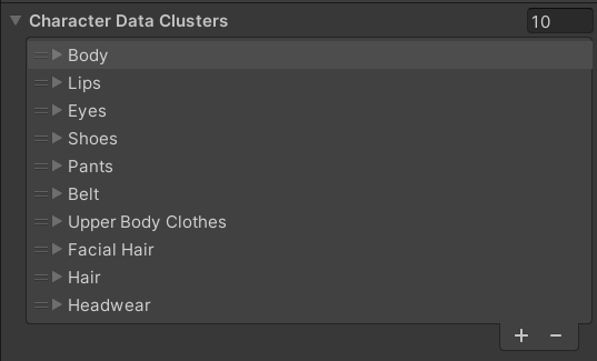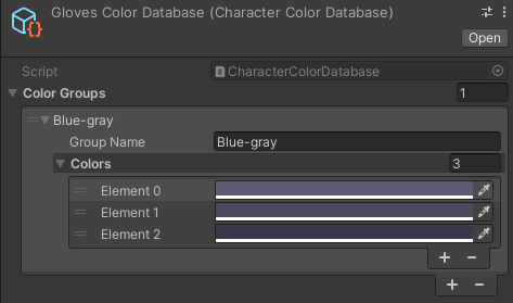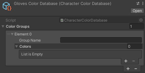 | Character Color Database | Scriptable Object | The Color Database for this specific Data Cluster should be placed here. Color Databases contain data for the colors that belong to this cluster. If this cluster is supposed to be meant for the character’s hair, the Color Database should contain all the different hair color options. |