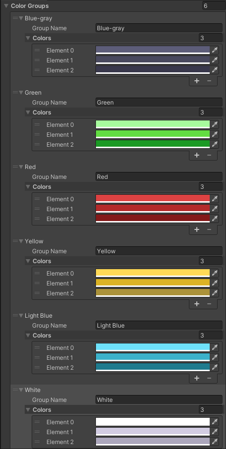 Upon inspecting the new Scriptable Object you’ll notice that it doesn’t contain any Color Groups yet. If you populate the list with a Color Group, your inspector window should match the preview below.