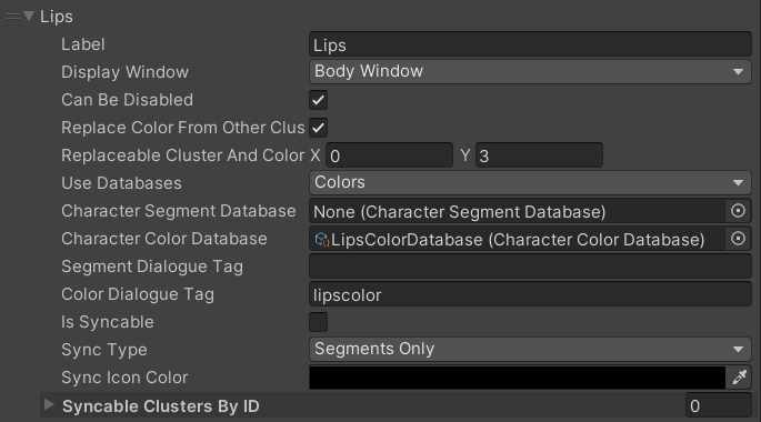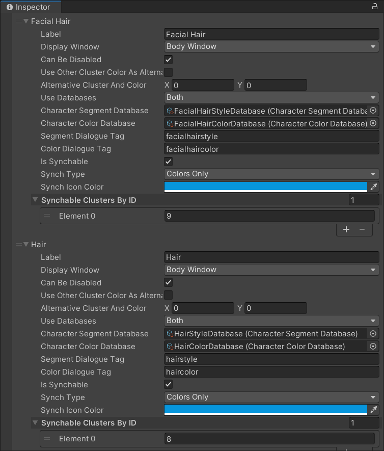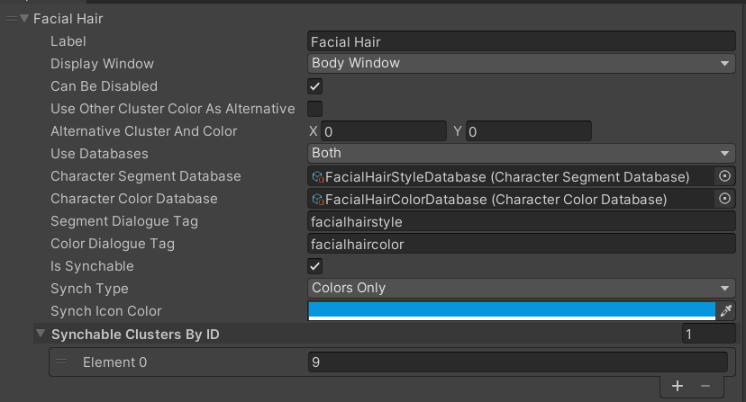 | Sync Type | Enum | If the boolean “Is Syncable” is enabled, this enum allows you to determine if segments (sprites), colors, or both should be synced with another Data Cluster. This can allow for scenarios where, for example, hairstyles (on head and face) don’t have to be synced, but hair colors do. |