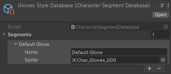 Drag the sprite sheet you added to the project into the empty sprite field of the Default Glove. If you’ve followed along entirely thus far, your GlovesStyleDatabase should now match the one below. You’ve now successfully created an equipable glove. Now all we have to do is ensure we can see this glove inside of the Character Creator.
