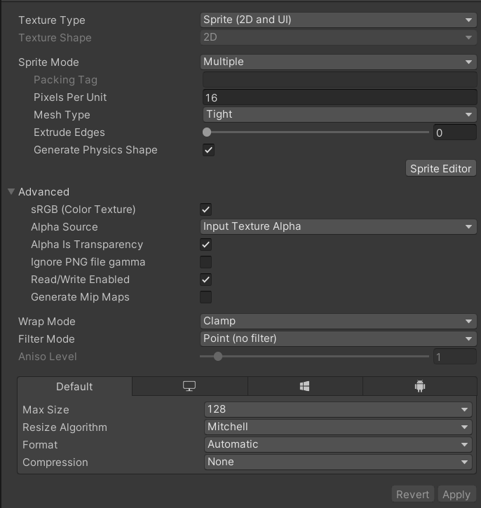 Before we continue, let’s check if the Texture Import Settings match the settings that we need. Click on the sprite sheet you just added to the project. If your export settings aren’t automatically set to the settings in the example screenshot above Step 5, you can fix the settings quite easily by doing the following: