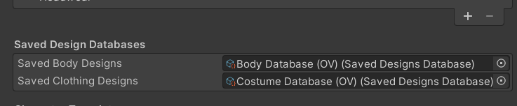 - Remove the Scriptable Objects in the “Character Segment Database” and “Character Color Database” sections. We’ll add new databases in a bit.