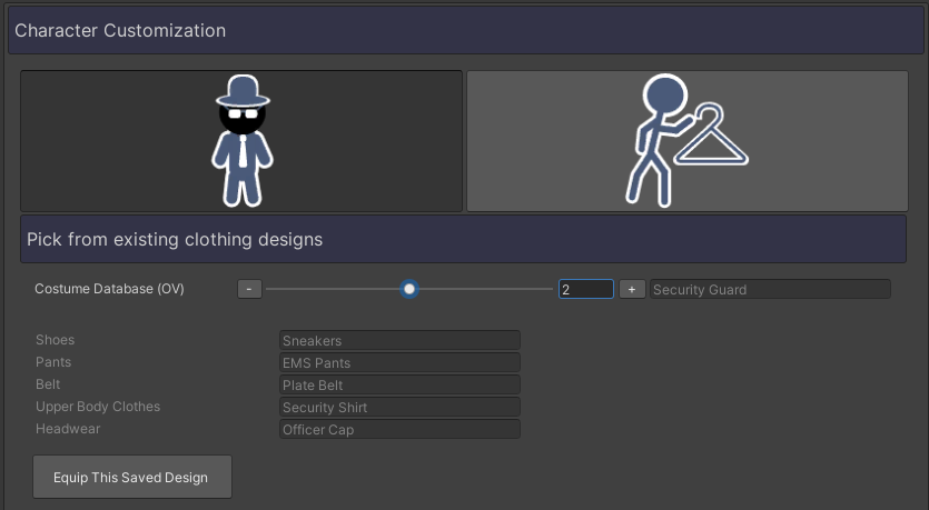 Your view should now resemble the screenshot. Your view will differ depending on the amount of saved designs you have stored in the database. Select the design you want by inputting the index number you want or by dragging the circle on the bar left or right. This will change the text on the right. The greyed-out text will display the name of the saved designs in the database. The name you just saved should (also) be in there. Below you can view all of the specific segments your character has equipped. At the bottom, there is a button called “Equip This Saved Design”. If you click that button, the design you selected will be equipped. Please note that if you don’t see any changes with your character, you need to click the “Saved Changes & Update Character button“.