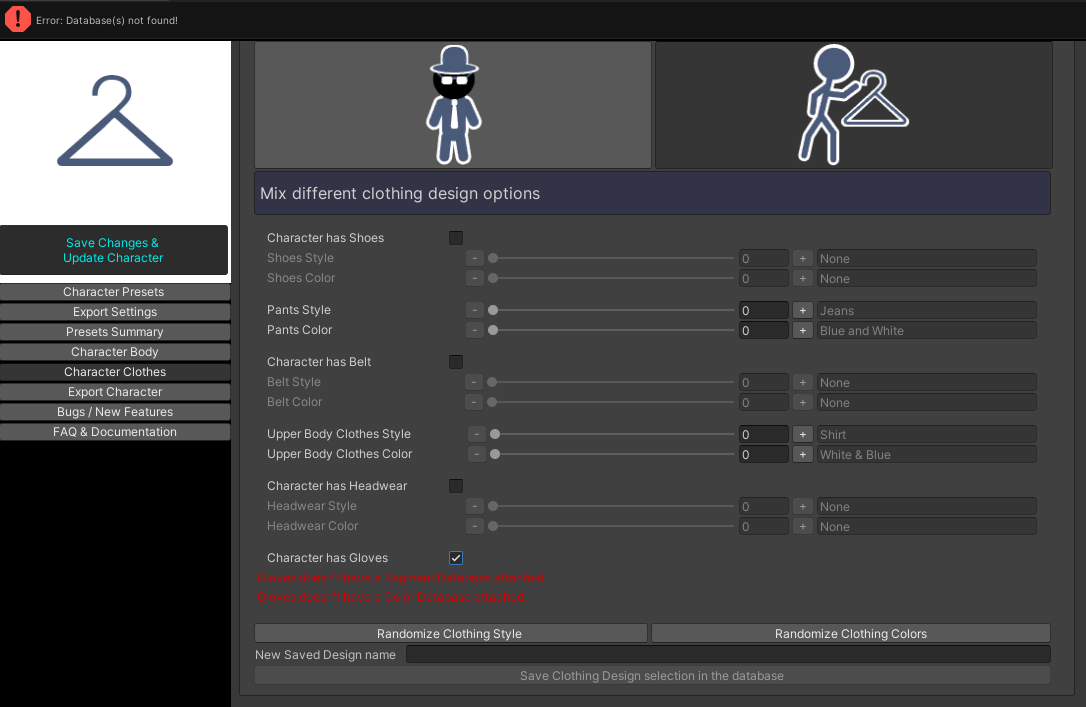 Now open the Character Creator by clicking on the button “Open Pixel Character Creator 2D” or double-clicking on the Scriptable Object itself. Upon opening the Creator Tool, you will be greeted with a red text at the top of the window: “Status Database(s) not found!“. This message is meant as a reminder that the Character Creator won’t function properly because we just added a new Data Cluster without any databases attached. For now, we can choose to ignore this message and try to create a character nonetheless. Click on the “Presets Summary” tab on the left, choose a name for your character, and press “Create new Character”.